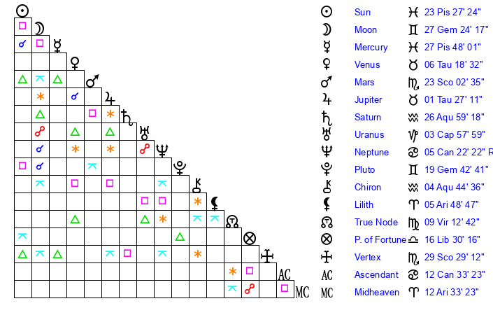 | Sun | 23 Pisces 27 | 24 Pisces 22 | 19 Cancer 38 |