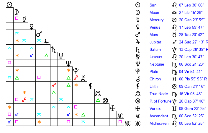 | Venus | 18 Leo 0 | 29 Gemini 28 | 7 Scorpio 58 |