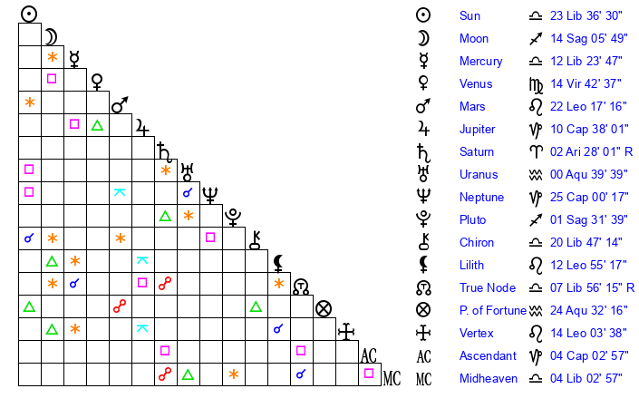 Sun | 23 Libra 36 | 23 Libra 49 | 21 Scorpio 36 |