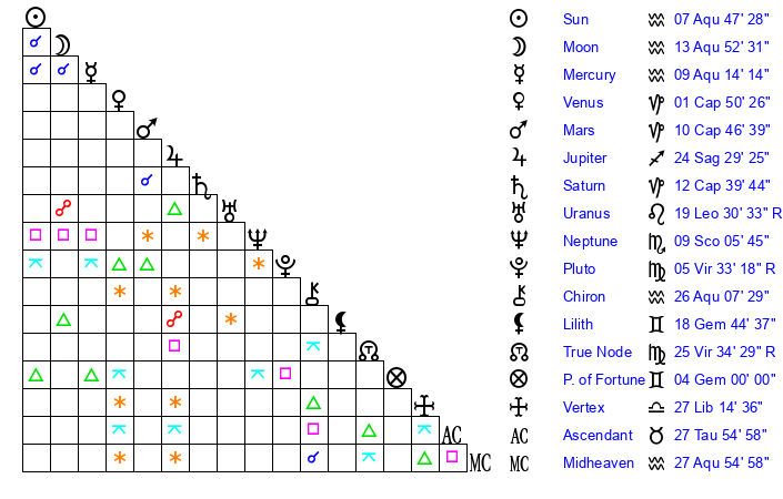 | Sun | 7 Aquarius 47 | 9 Aquarius 2 | 12 Aries 57 |