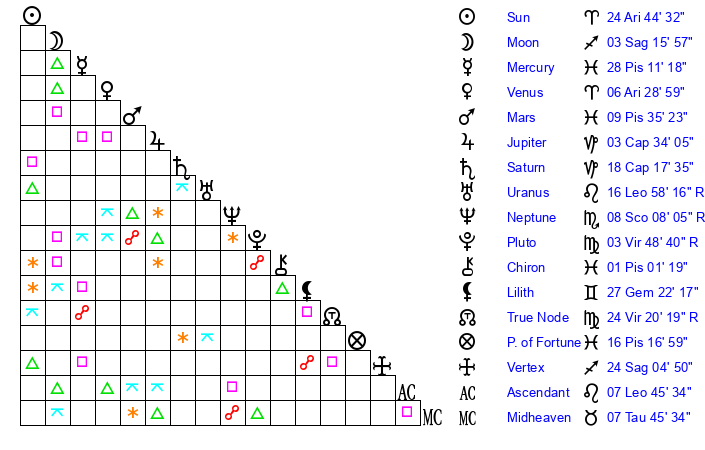| Sun | 24 Aries 44 | 25 Aries 0 | 27 Gemini 26 |