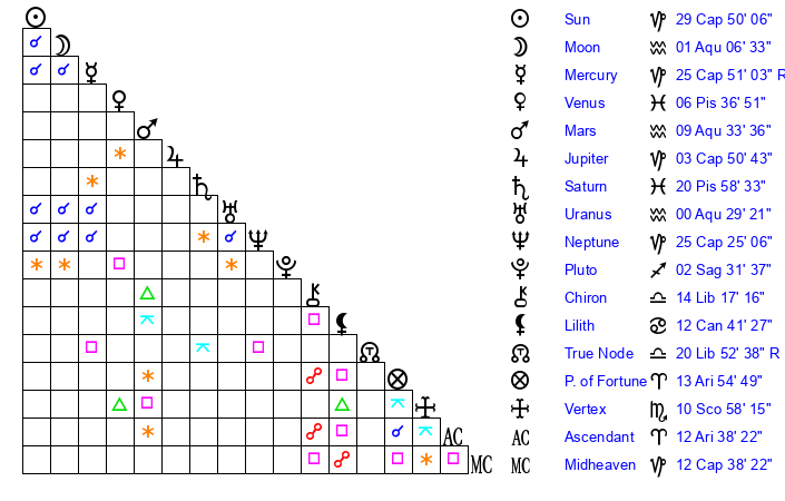 Sun | 29 Capricorn 50 | 0 Aquarius 48 | 29 Aquarius 14 |