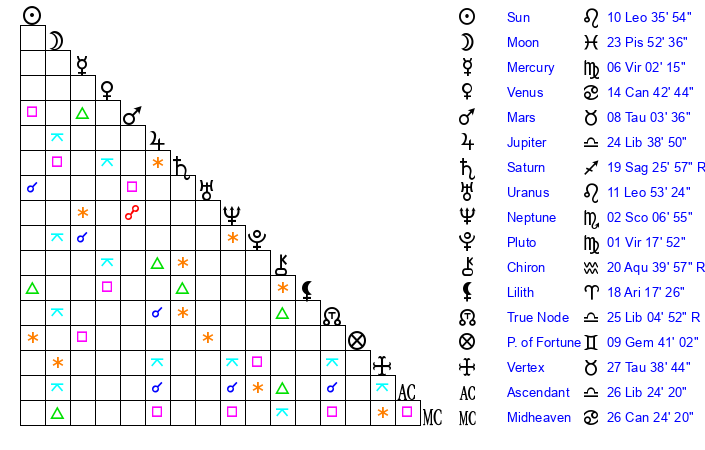 | Moon | 23 Pisces 53 | 2 Sagittarius 27 | 28 Leo 15 |