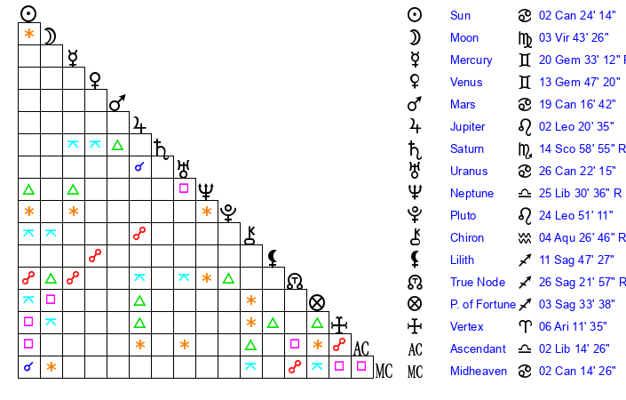 | Mercury | 20 Gemini 32 | 27 Cancer 10 | 1 Libra 45 |