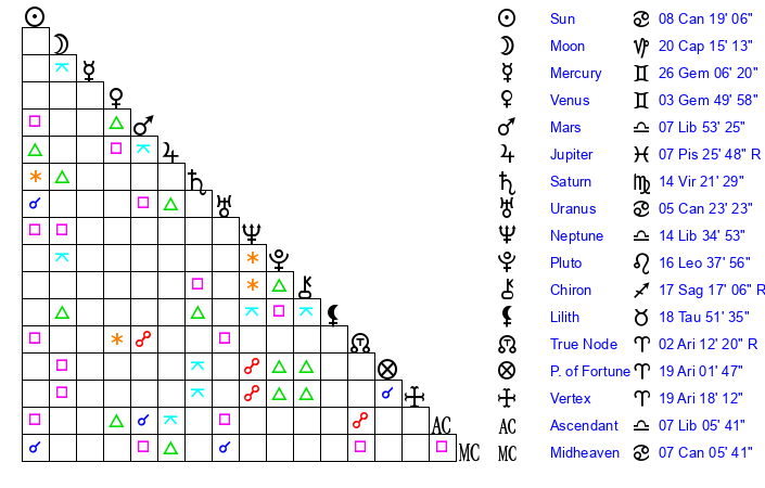 | Jupiter | 7 Pisces 18 | 4 Cancer 45 | 0 Pisces 0 |