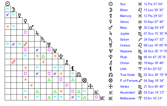 | Neptune | 4 Scorpio 34 | 28 Pisces 59 | 2 Scorpio 59 |