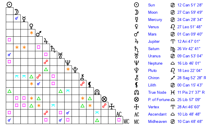 | Moon | 28 Cancer 5 | 15 Scorpio 30 | 21 Aries 26 |