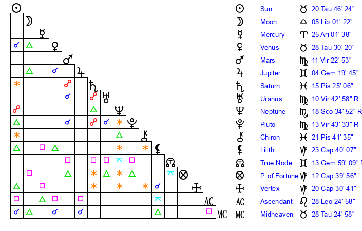 | Neptune | 18 Scorpio 34 | 1 Aries 24 | 17 Scorpio 19 |