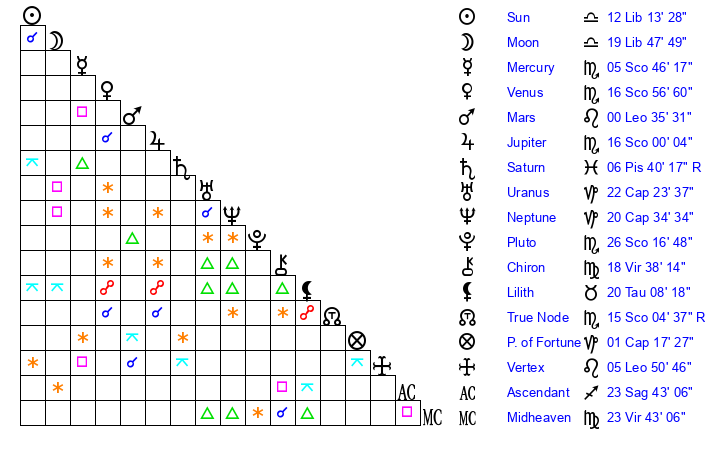 Moon | 19 Libra 38 | 22 Pisces 50 | 13 Sagittarius 9 |