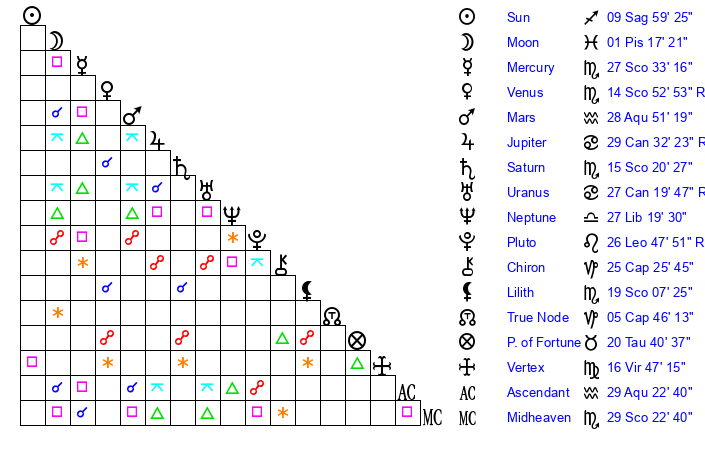 | Saturn | 15 Scorpio 47 | 25 Pisces 5 | 21 Scorpio 23 |