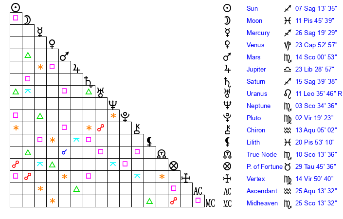 | Sun | 7 Sagittarius 13 | 7 Sagittarius 43 | 16 Aquarius 24 |
