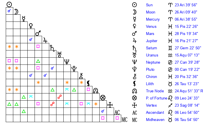 Sun | 23 Aries 39 | 25 Aries 0 | 9 Leo 18 |