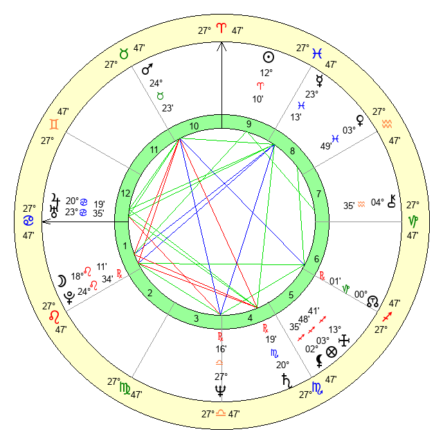 | Moon | 18 Leo 13 | 12 Gemini 27 | 27 Aquarius 58 |