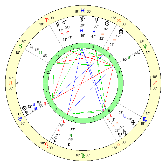 | Moon | 20 Pisces 12 | 2 Libra 31 | 2 Scorpio 41 |