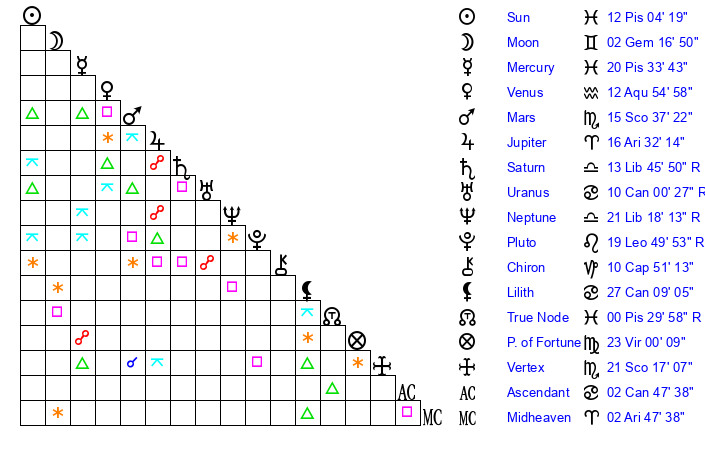 | Sun | 12 Pisces 4 | 12 Pisces 22 | 23 Taurus 49 |