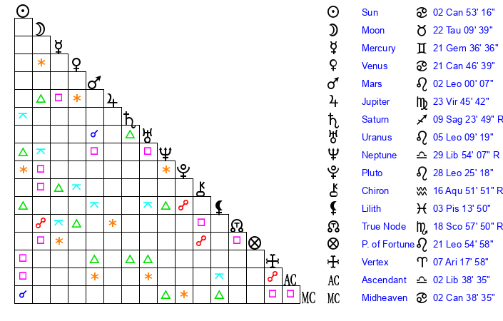 | Moon | 22 Taurus 6 | 23 Gemini 25 | 2 Sagittarius 13 |