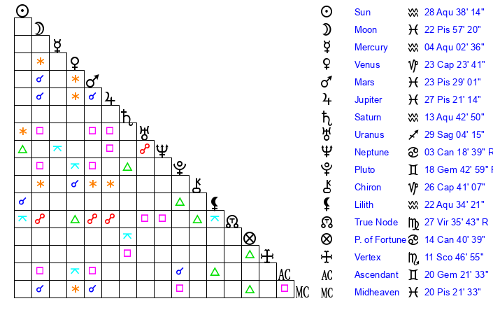 | Sun | 28 Aquarius 38 | 0 Pisces 17 | 26 Gemini 59 |