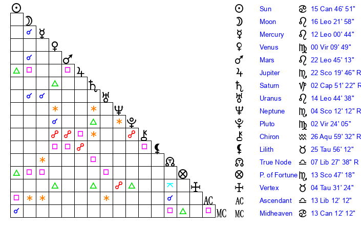 | Sun | 15 Cancer 46 | 16 Cancer 47 | 19 Virgo 11 |
