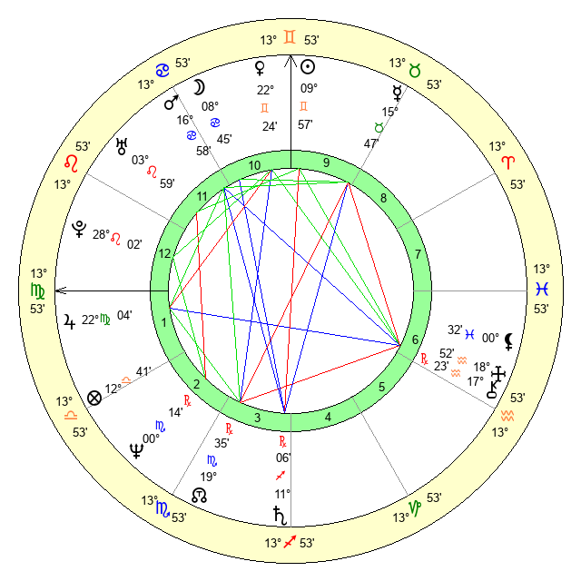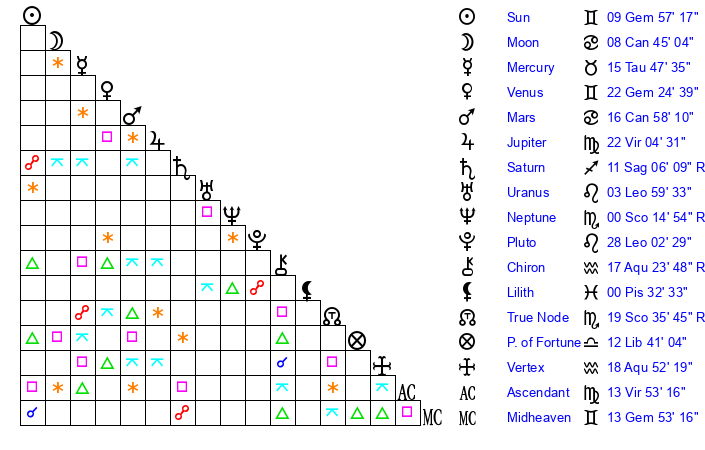 | Sun | 9 Gemini 57 | 10 Gemini 29 | 14 Leo 54 |