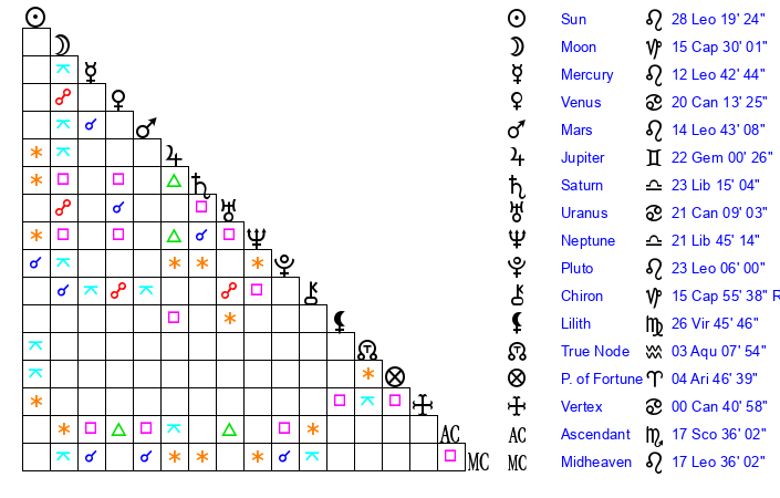 | Moon | 15 Capricorn 29 | 9 Leo 47 | 13 Virgo 49 |