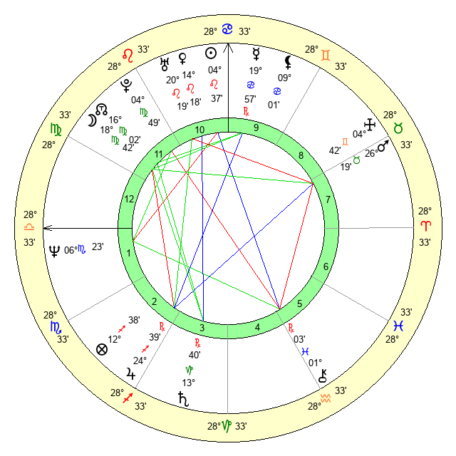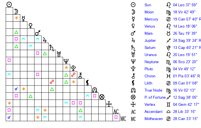 | Venus | 14 Leo 18 | 26 Gemini 1 | 4 Scorpio 17 |