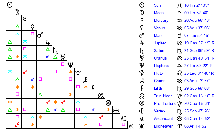| Sun | 18 Pisces 21 | 19 Pisces 22 | 26 Taurus 58 |