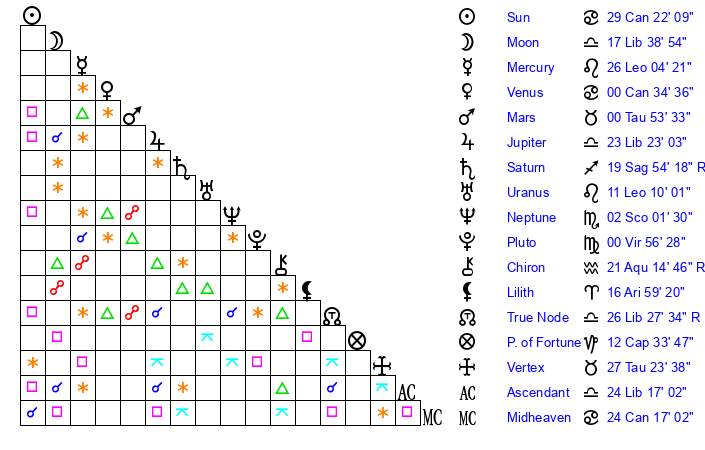 | Venus | 0 Cancer 34 | 20 Gemini 17 | 22 Virgo 32 |