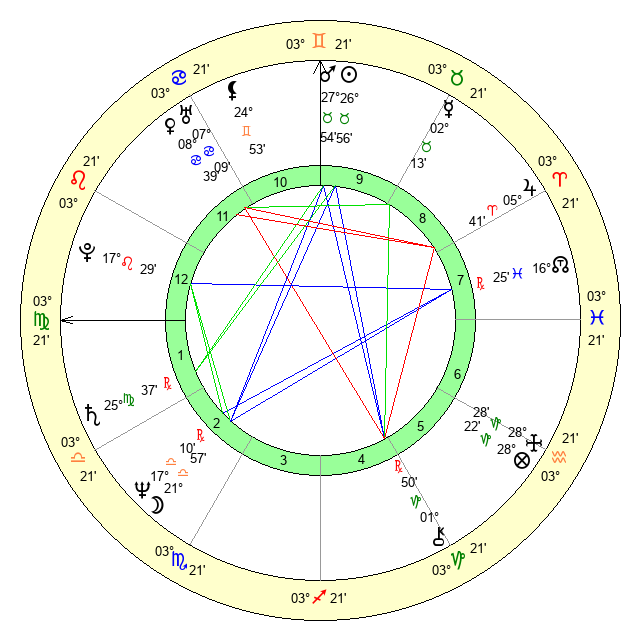 | Venus | 8 Cancer 39 | 12 Aries 53 | 15 Virgo 31 |