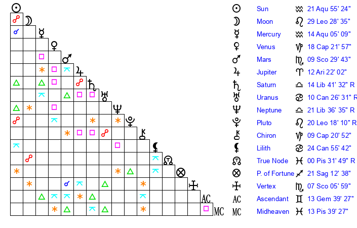 | Pluto | 20 Leo 17 | 2 Aquarius 23 | 19 Leo 5 |