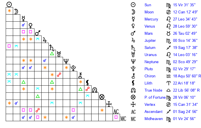 | Mercury | 27 Leo 34 | 11 Virgo 53 | 13 Sagittarius 1 |