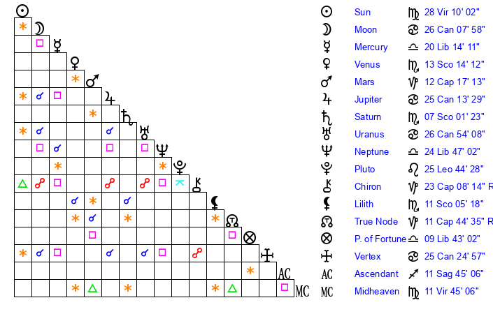 | Moon | 26 Cancer 2 | 27 Virgo 27 | 18 Aquarius 16 |
