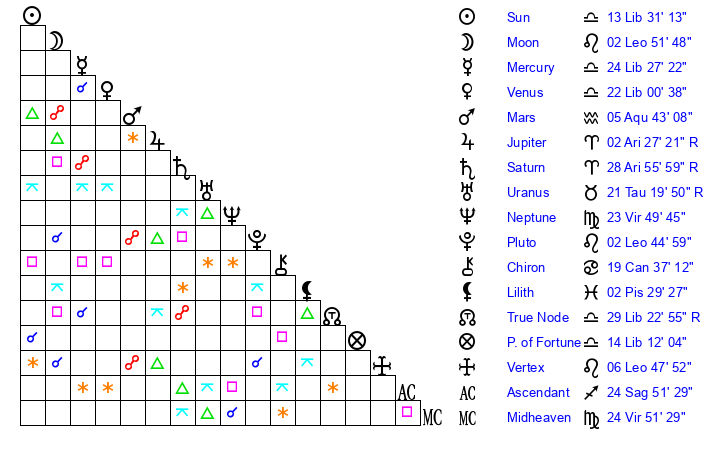 | Moon | 2 Leo 48 | 22 Aries 13 | 3 Libra 32 |