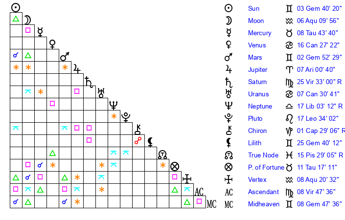 | Sun | 3 Gemini 40 | 4 Gemini 44 | 14 Leo 22 |