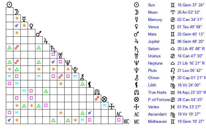 | Sun | 16 Gemini 37 | 17 Gemini 12 | 25 Leo 26 |