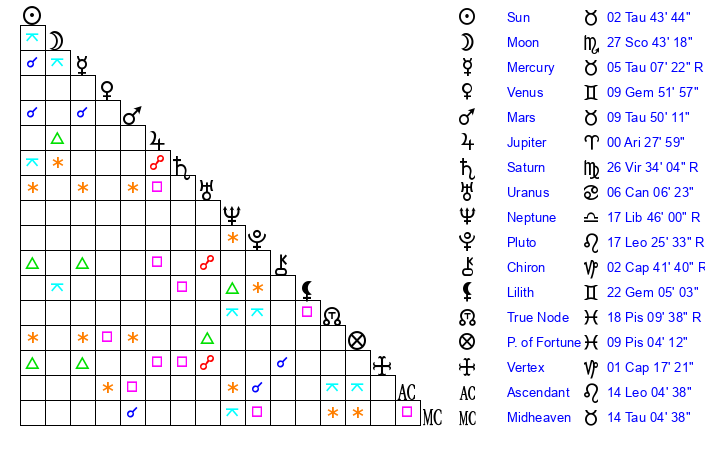 | Neptune | 17 Libra 45 | 0 Aries 51 | 16 Libra 46 |