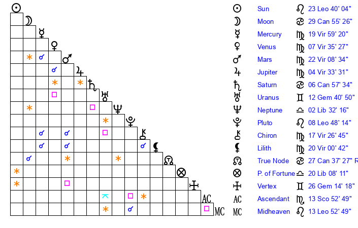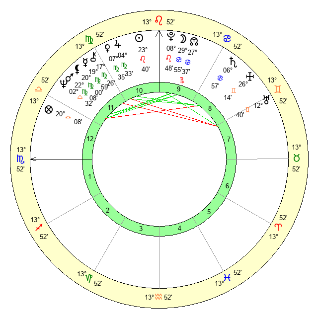 | Sun | 23 Leo 40 | 24 Leo 5 | 13 Scorpio 10 |