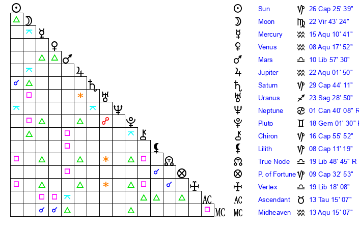 | Moon | 22 Virgo 37 | 12 Virgo 30 | 28 Aquarius 8 |