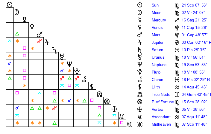 | Neptune | 19 Scorpio 54 | 29 Pisces 31 | 21 Scorpio 47 |