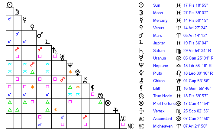 | Neptune | 18 Libra 57 | 29 Pisces 10 | 17 Libra 7 |