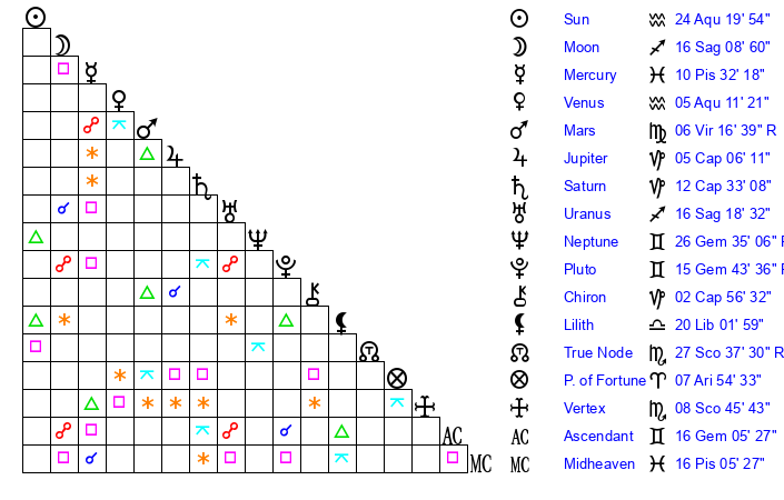 | Pluto | 15 Gemini 43 | 2 Aquarius 26 | 17 Gemini 23 |