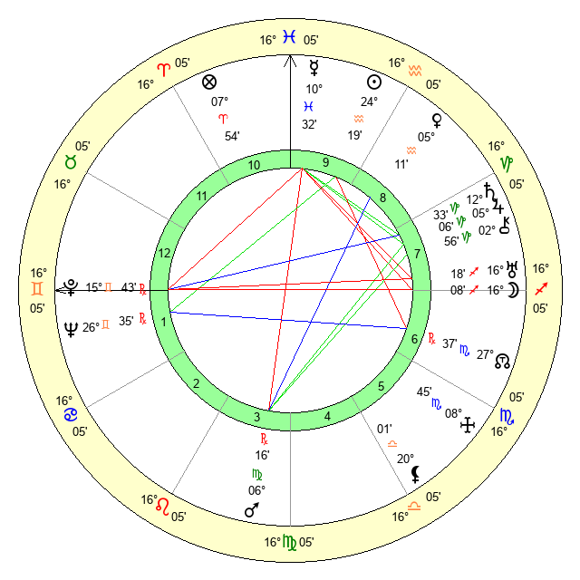 | Moon | 16 Sagittarius 2 | 8 Virgo 8 | 11 Cancer 9 |