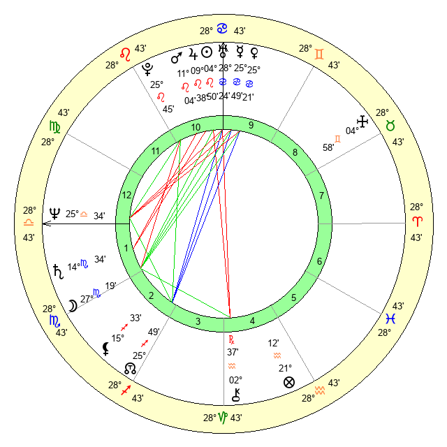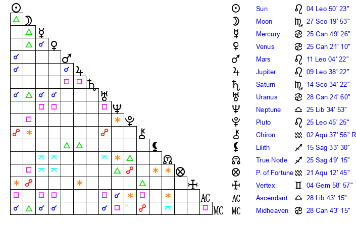 | Moon | 27 Scorpio 28 | 23 Virgo 28 | 17 Gemini 42 |