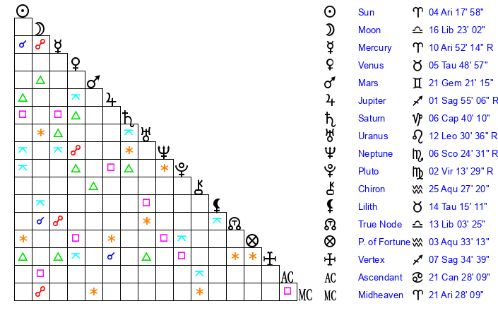 | Moon | 16 Libra 20 | 14 Aquarius 24 | 24 Pisces 17 |
