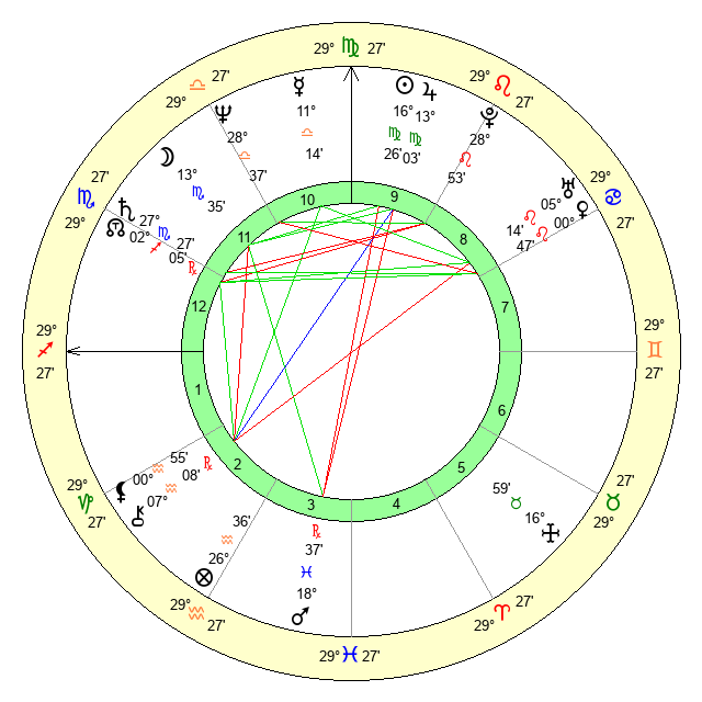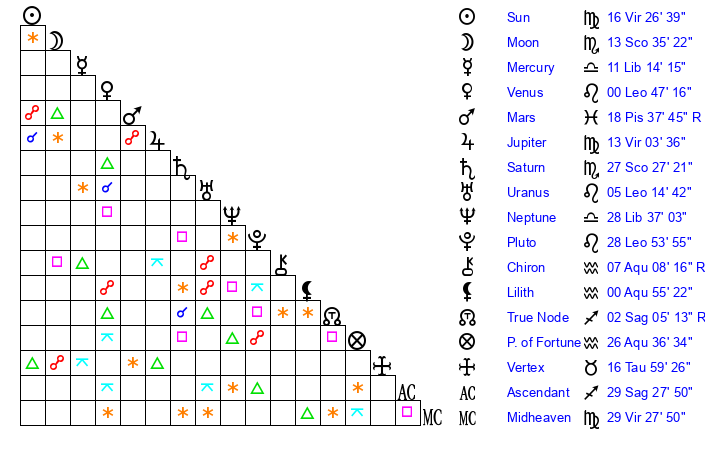 | Saturn | 27 Scorpio 54 | 29 Pisces 19 | 4 Sagittarius 31 |