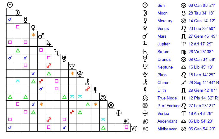 | Mars | 27 Gemini 47 | 7 Virgo 36 | 16 Leo 6 |