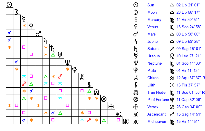 | Moon | 28 Libra 52 | 15 Scorpio 55 | 17 Aries 29 |