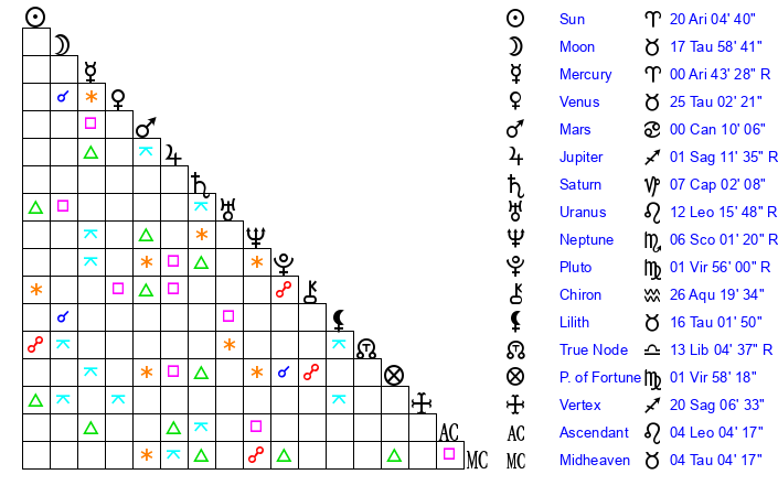 | Sun | 20 Aries 4 | 21 Aries 4 | 23 Gemini 50 |
