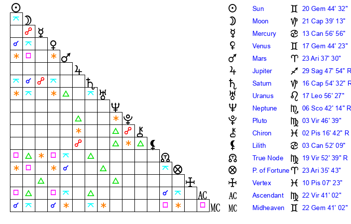 | Moon | 21 Capricorn 35 | 25 Sagittarius 28 | 9 Gemini 22 |