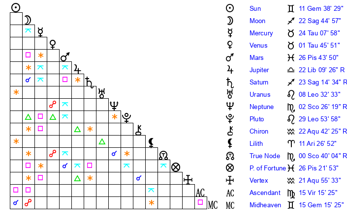 | Moon | 22 Sagittarius 46 | 7 Virgo 26 | 26 Taurus 10 |