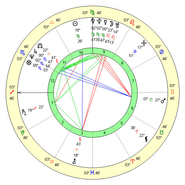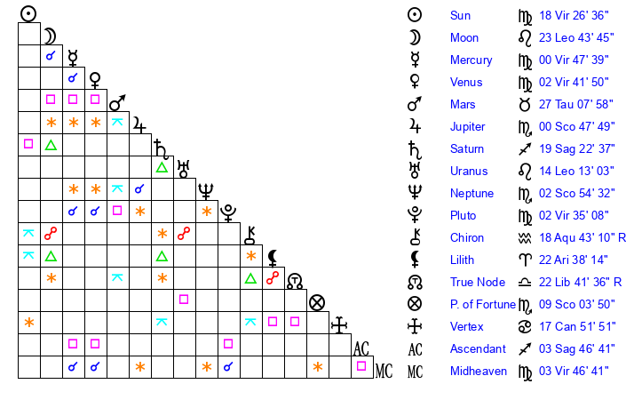 | Sun | 18 Virgo 26 | 19 Virgo 12 | 24 Scorpio 50 |